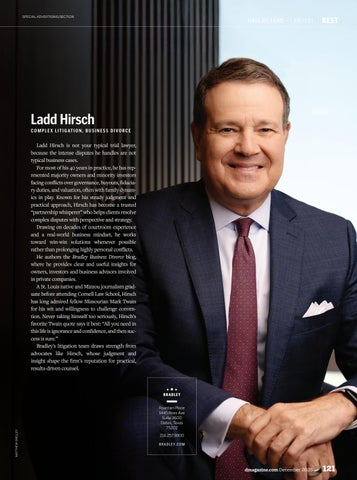 Bradley attorney Ladd Hirsch was featured in D Magazine for his inclusion in the 2025 D Best Hall of Fame, which honors lawyers, doctors, and dentists who have been named among the best in their fields by their peers for at least 15 years.